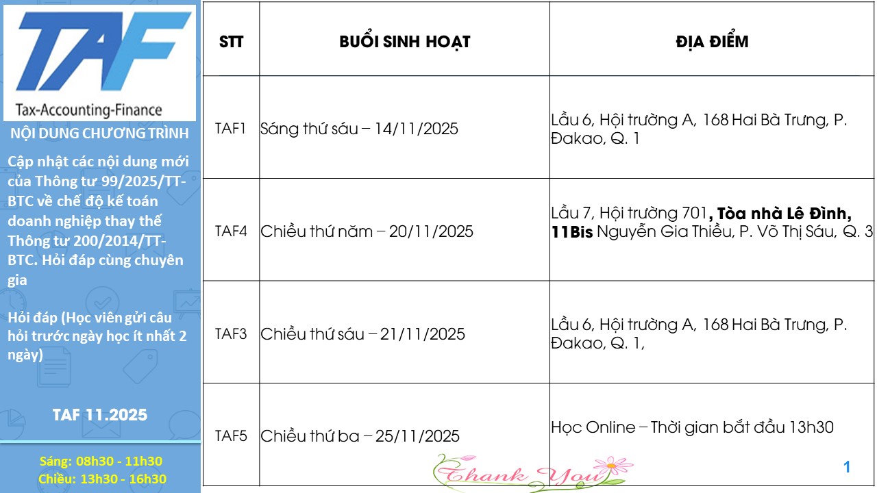 Chuyên đề: Chương trình cập nhật kiến thức thuế kế toán TAF kỳ tháng 11/2025