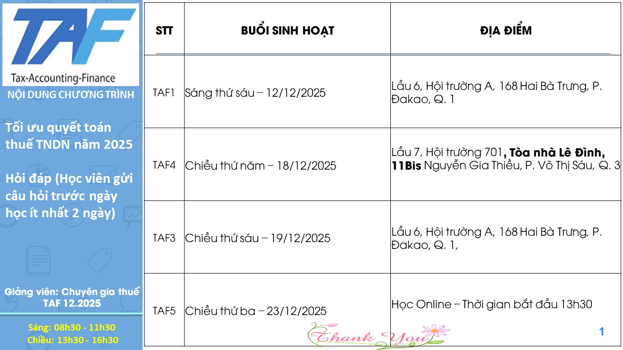 Chuyên đề: Chương trình cập nhật kiến thức thuế kế toán TAF kỳ tháng 12/2025